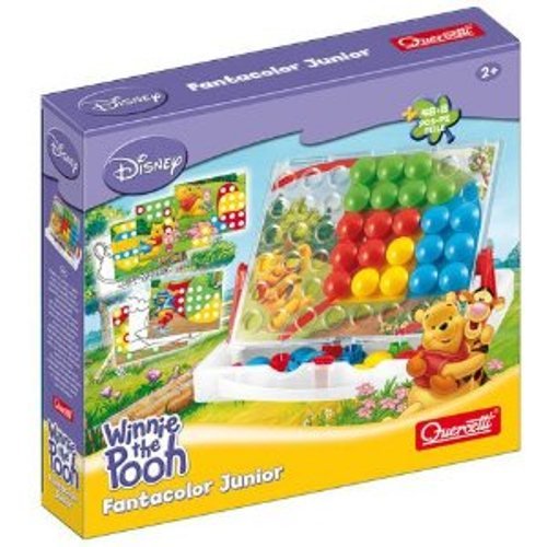 schönes und edles Kleinkindspielzeug von Quercetti, das Steckspiel kommt mit richtig großen Knöpfen und 16 Vorlagen die vom Kind gesteckt werden können mit den beliebten Figuren von Winnie Pooh